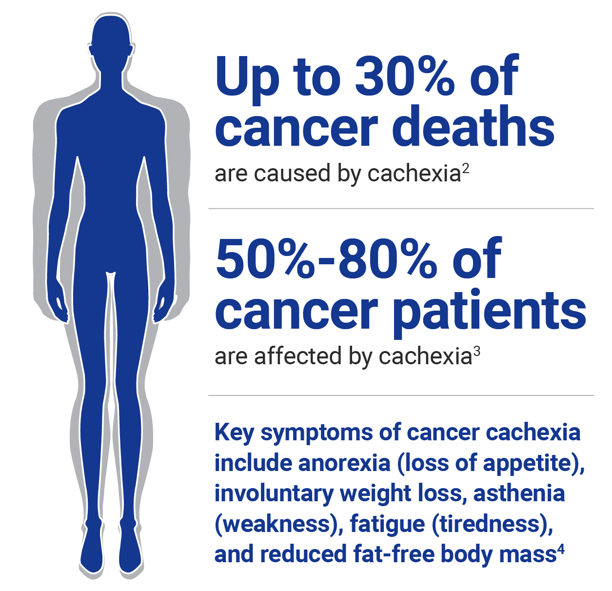 References: 1. Roeland EJ, Bohlke K, Baracos VE, et al. Management of cancer cachexia: ASCO guideline. J Clin Oncol. 2020;38(21):2438-2453. 2. von Haehling S, Anker SD. Cachexia as a major underestimated and unmet medical need: facts and numbers. J Cachexia Sarcopenia Muscle. 2010;1(1):1-5. 3. von Haehling S, Anker SD. Prevalence, incidence and clinical impact of cachexia: facts and numbers update—update 2014. J Cachexia Sarcopenia Muscle. 2014;5(4):261-263. 4. Argilés JM, López-Soriano FJ, Stemmler B, Busquets S. Cancer-associated cachexia — understanding the tumour macroenvironment and microenvironment to improve management. Nat Rev Clin Oncol. 2023;20(4):250-264. 5. Reid J, McKenna H, Fitzsimons, McCance T. The experience of cancer cachexia: a qualitative study of advanced cancer patients and their family members. Int J Nurs Stud. 2009;46(5):606-616.